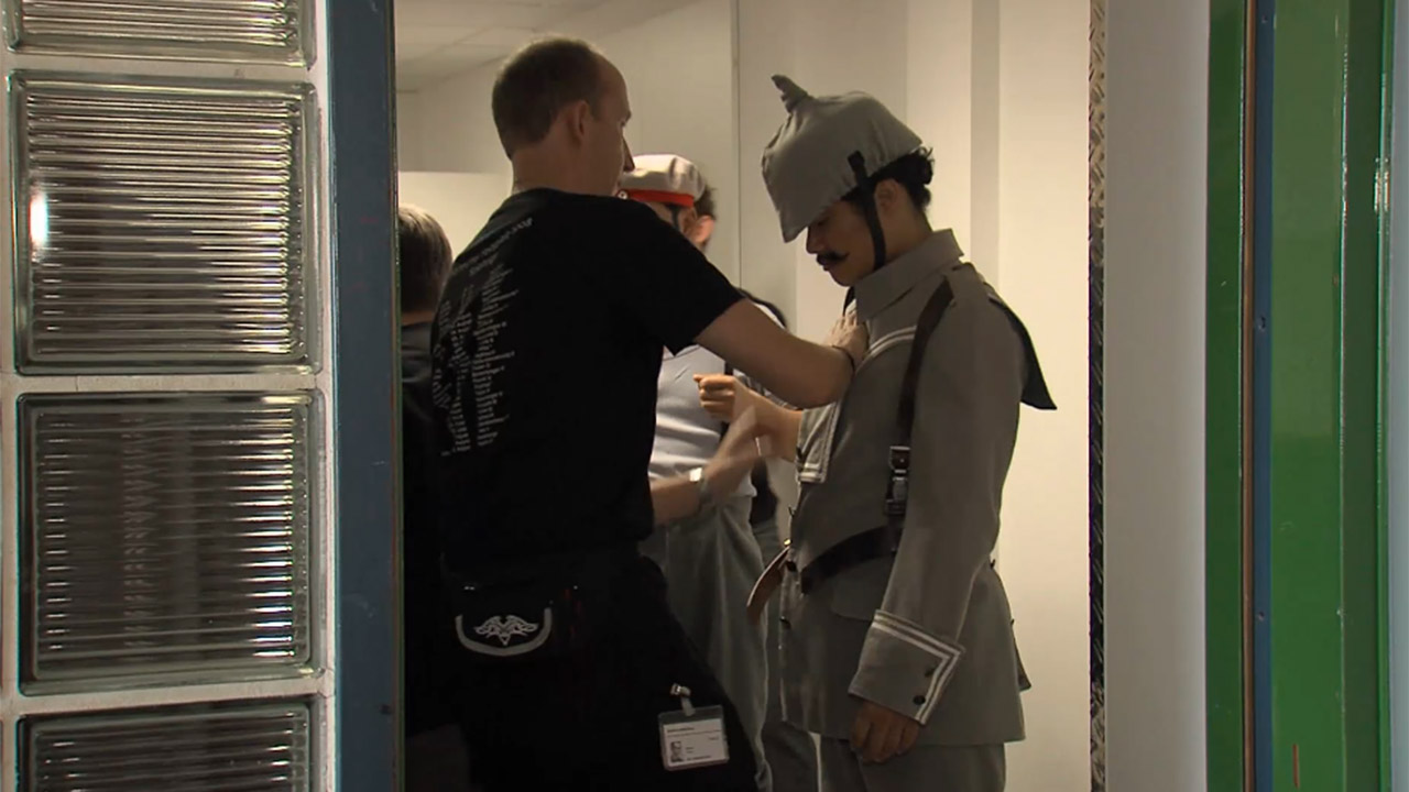 Ein schneller Umzug im Parsifal. In nur wenigen Minuten findet der Kostümwechsel des Herrenchors im ersten Aufzug statt: raus aus den wilhelminischen Kostümen und rein in die Uniformen. Da ist jeder Handgriff der Garderobieren und Garderobiers genau festgelegt.